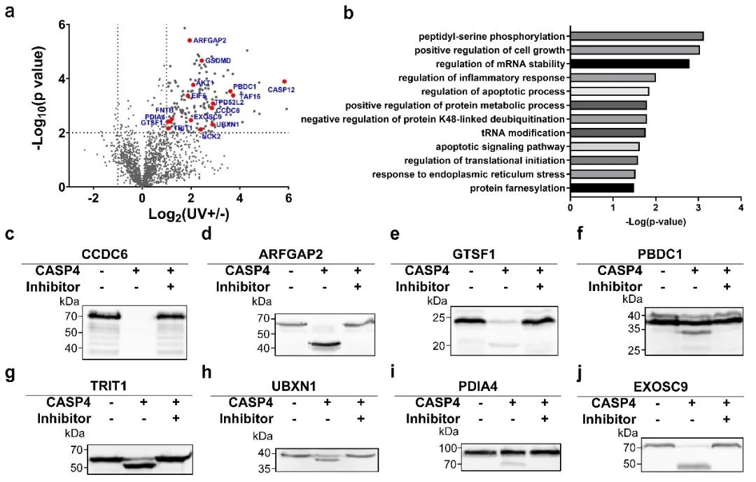 结合定量蛋白质组学(Label-Free Quantification, LFQ),研究人员从THP-1细胞裂解液中鉴定出156种潜在底物。为验证技术可靠性,研究人员选取部分候选蛋白进行体外切割实验,证实了包括AKT1、CASP5/12在内的16种蛋白可被Caspase-4切割。这些实验结果不仅验证了光交联探针技术的高效性与准确性,更通过新底物的发现为解析焦亡通路中酶-底物结合特异性、信号交叉调控等关键科学问题提供了重要线索。