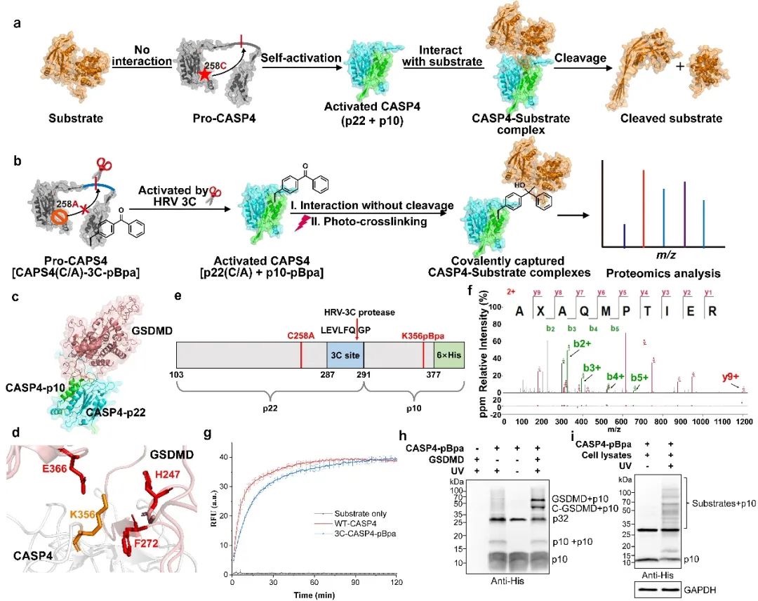 研究人员基于Caspase-4与底物GSDMD的互作界面,利用基因密码子扩展技术,将光敏非天然氨基酸pBpa精准嵌入Caspase-4的底物结合区域(K356位点),构建了光交联探针CASP4(C258A)-3C-pBpa。并巧妙引入三重功能模块:第一,通过C258A催化位点突变消除蛋白酶活性,避免底物降解导致的信号丢失;第二,插入HRV-3C蛋白酶切割位点维持天然构象与底物结合能力;第三,利用pBpa的光交联特性共价锁定瞬时相互作用。该探针成功克服传统方法的技术瓶颈,实现了对弱结合底物的高效捕获。