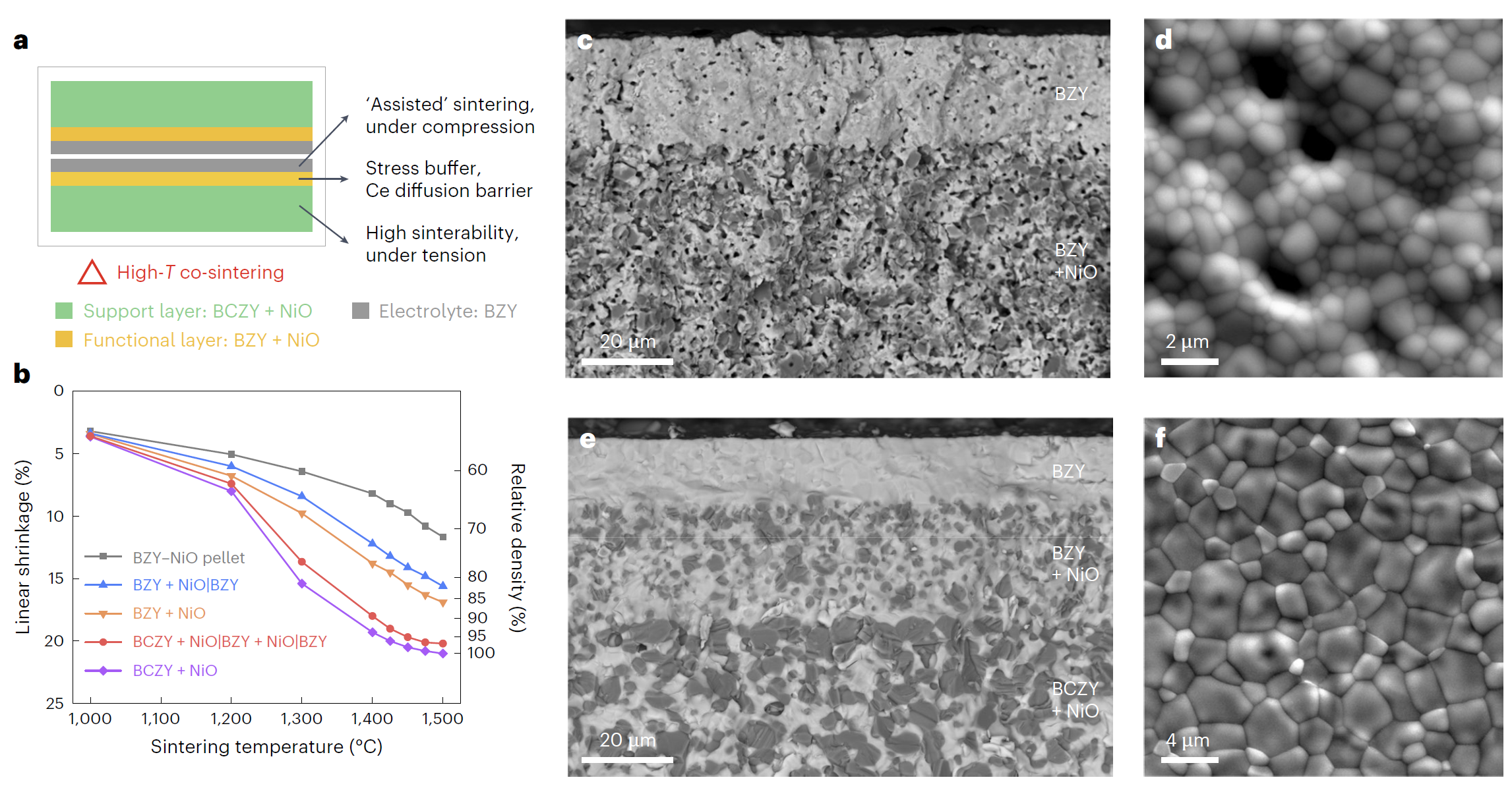 基于上述背景,mk手机注册材料学院董岩皓助理教授与合作者美国新墨西哥州立大学罗红梅教授、美国麻省理工学院李巨教授和美国爱达荷国家实验室丁冬研究员提出了基于高活性支撑层烧结应力辅助的多层共烧技术,通过支撑层、过渡层和质子膜中氧化镍第二相和铈掺杂浓度的一体化设计,首次在1450摄氏度实现了无烧结助剂、高致密度锆酸钡基质子膜和高性能电化学器件的制备(图1)。研究表明,锆酸钡基质子膜燃料电池和电解池具有优异的电化学性能和稳定性(图2),能够在450至600摄氏度、0.5至0.7个大气压的高水蒸气分压和0.5至2.0安培每平方厘米的高电解电流下展现出高法拉第效率和优异的稳定性,相较于传统的铈酸钡基电解质优势明显。锆酸钡陶瓷烧结技术的突破,有望为高功率密度陶瓷质子膜燃料电池和极端工况电解池的研发与应用提供有力支撑。