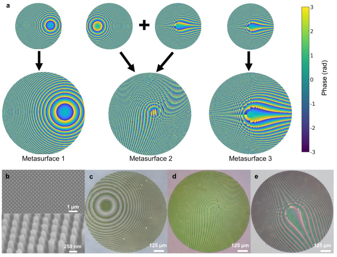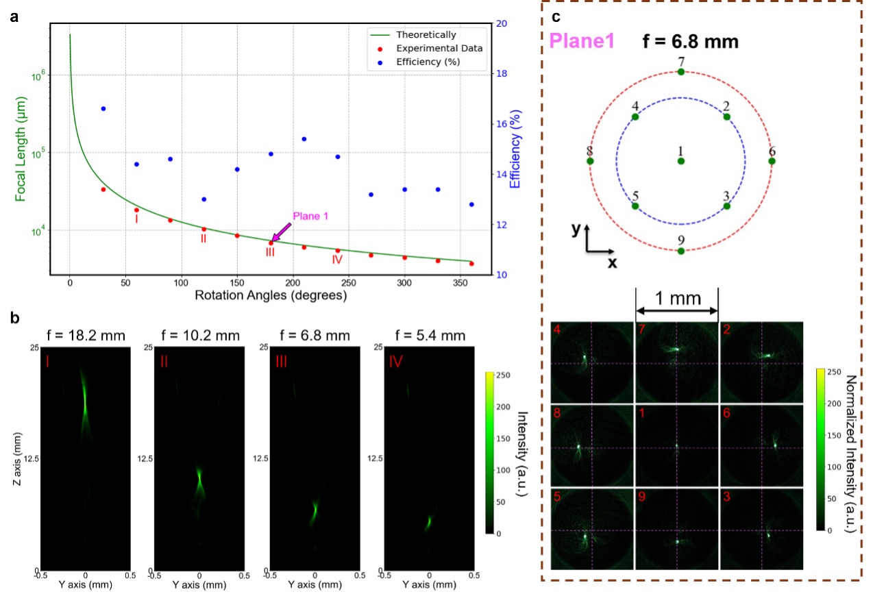 基于此,研究团队创新性地提出了一种基于莫尔理论的三维可变焦超构元件。该元件由三个级联的超表面组成,通过精心设计的相位轮廓实现了焦点位置的动态调控。实验结果表明,该超构元件可在3.7至33.2毫米范围内连续调节焦距,同时实现横向焦点的灵活调整,动态眼动范围达到4.2至5.8毫米。