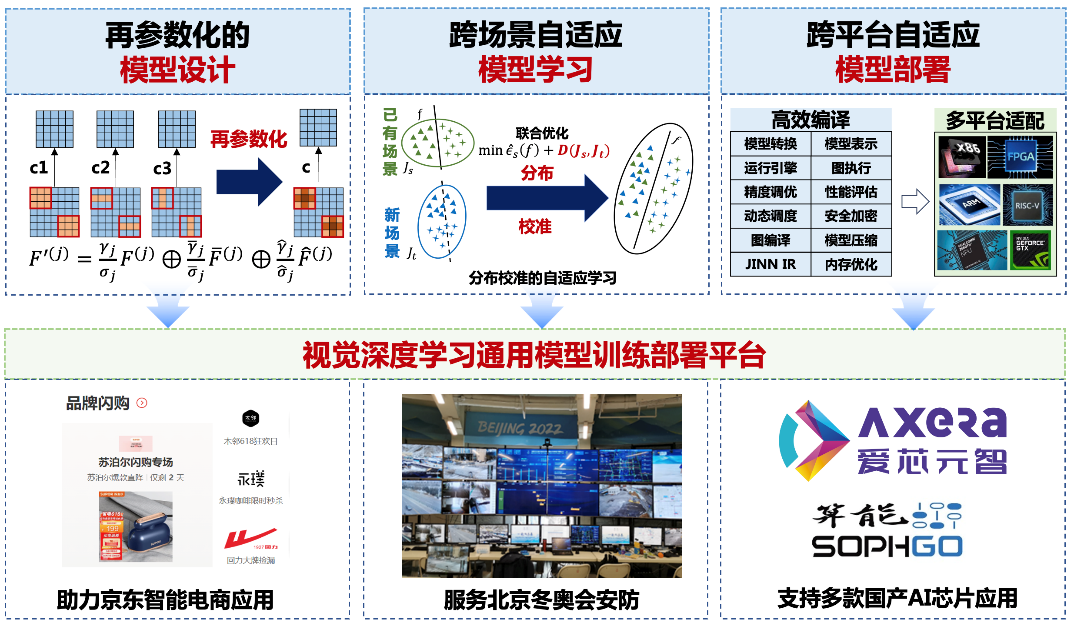 软件学院丁贵广团队提出了非对称深度学习模型设计方法,设计了极简通用的卷积基础模型RepVGG,发明了跨场景自适应深度学习模型训练技术,研制了跨平台自适应模型压缩与部署平台,解决了国产AI芯片在多场景应用条件下的快速训练和部署难题,在公共安全、互联网、AI芯片、工业制造等领域广泛应用,经济社会效益显著。“高效自适应视觉深度学习关键技术研究与应用”成果获得2024年度中国电子学会科技进步一等奖。