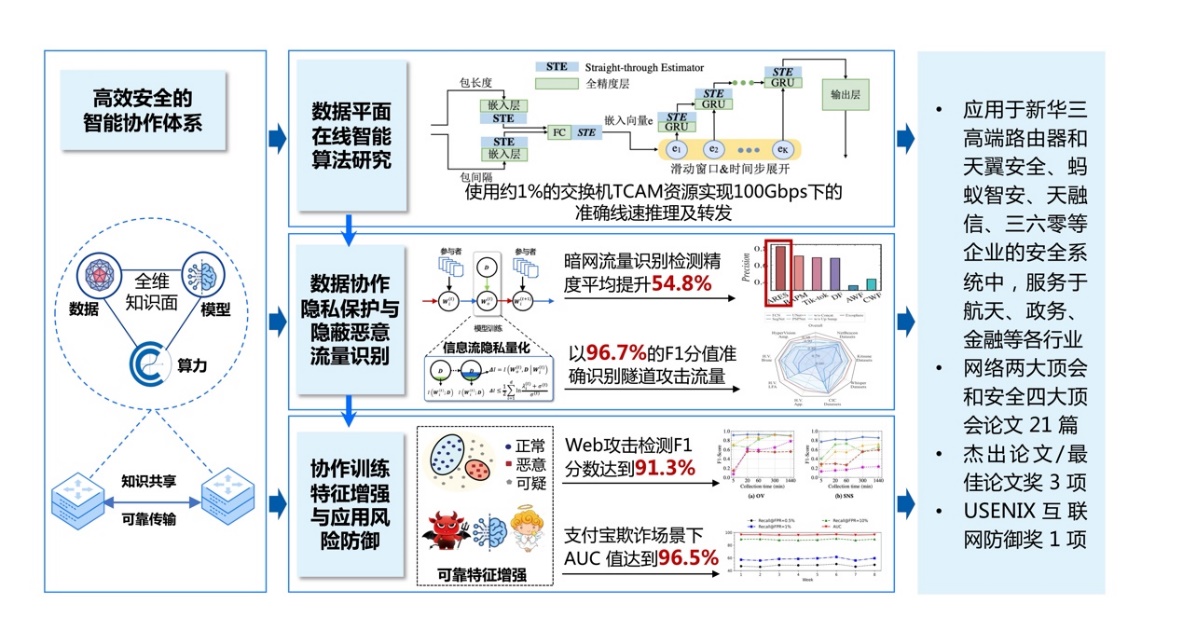 计算机系徐恪团队聚焦互联网跨域可信访问难题,以高效协作为牵引,建立了面向安全可信互联网的协作学习平台,突破了数据平面高效智能推理、隐蔽恶意流量高效识别、应用风险精准防御等关键技术,研制了国内首台原生支持数据平面智能的可编程交换设备,实现了新一代智能风控系统,为航天、金融、政务等关键领域提供安全技术支撑,显著提升了互联网应对未知动态威胁的能力。“高效协作的互联网动态行为安全可信关键技术与应用”成果获得2024年度中国电子学会科技进步一等奖。