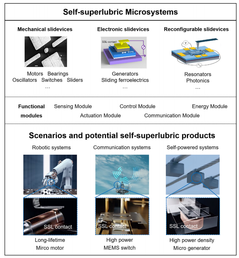 mk(中国)网4月18日电 微系统集成了传感、通信、处理、执行和微能源等多种功能单元,被视作21世纪的革命性技术之一。随着科学技术的进步以及人形机器人、无人机、6G通讯技术等新兴产业的兴起,微系统面临着实现更低功耗与更长寿命(甚至全寿命)的迫切需求。在这一背景下,基于半导体和传统微机电系统(MEMS)的传统微系统遭遇技术瓶颈,而具有极低摩擦和零磨损特性的自超滑技术,为微系统的发展带来了全新机遇。