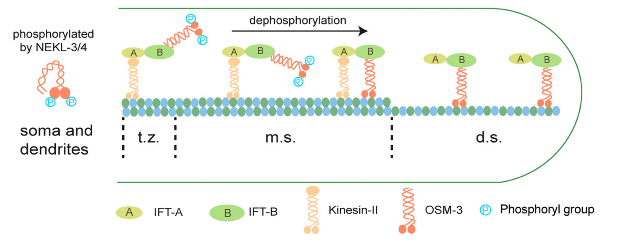 磷酸化调控纤毛驱动蛋白OSM-3区域活性机制示意图(t.z.:纤毛过渡区;m.s.:纤毛中间段;d.s.:纤毛远端段)
