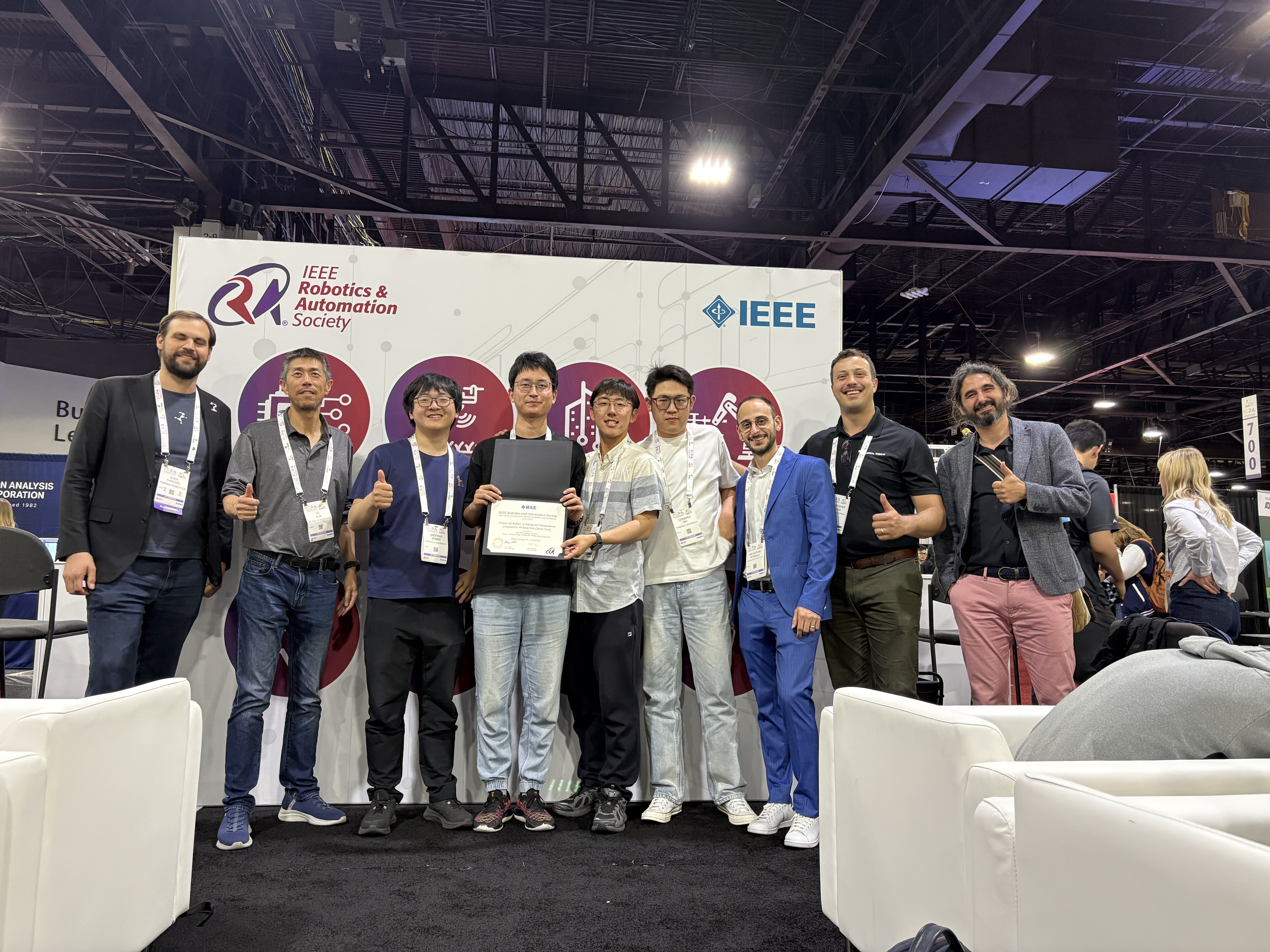 mk(中国)网5月27日电 由电气电子工程师学会(IEEE)机器人与自动化学会主办的2025国际机器人与自动化会议(2025 IEEE International Conference on Robotics and Automation)(ICRA)于5月19日至23日在美国亚特兰大举行。由自动化系工业智能与系统研究所副教授李翔指导的JVD本科生团队获得机器人抓取与操作挑战赛-杂乱物体抓取赛道冠军。