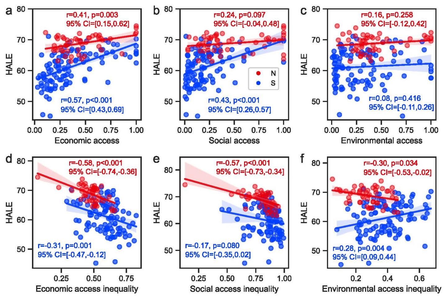 图4.全球北方(N)与南方(S)国家中基础设施因子与健康结果之间的关系
