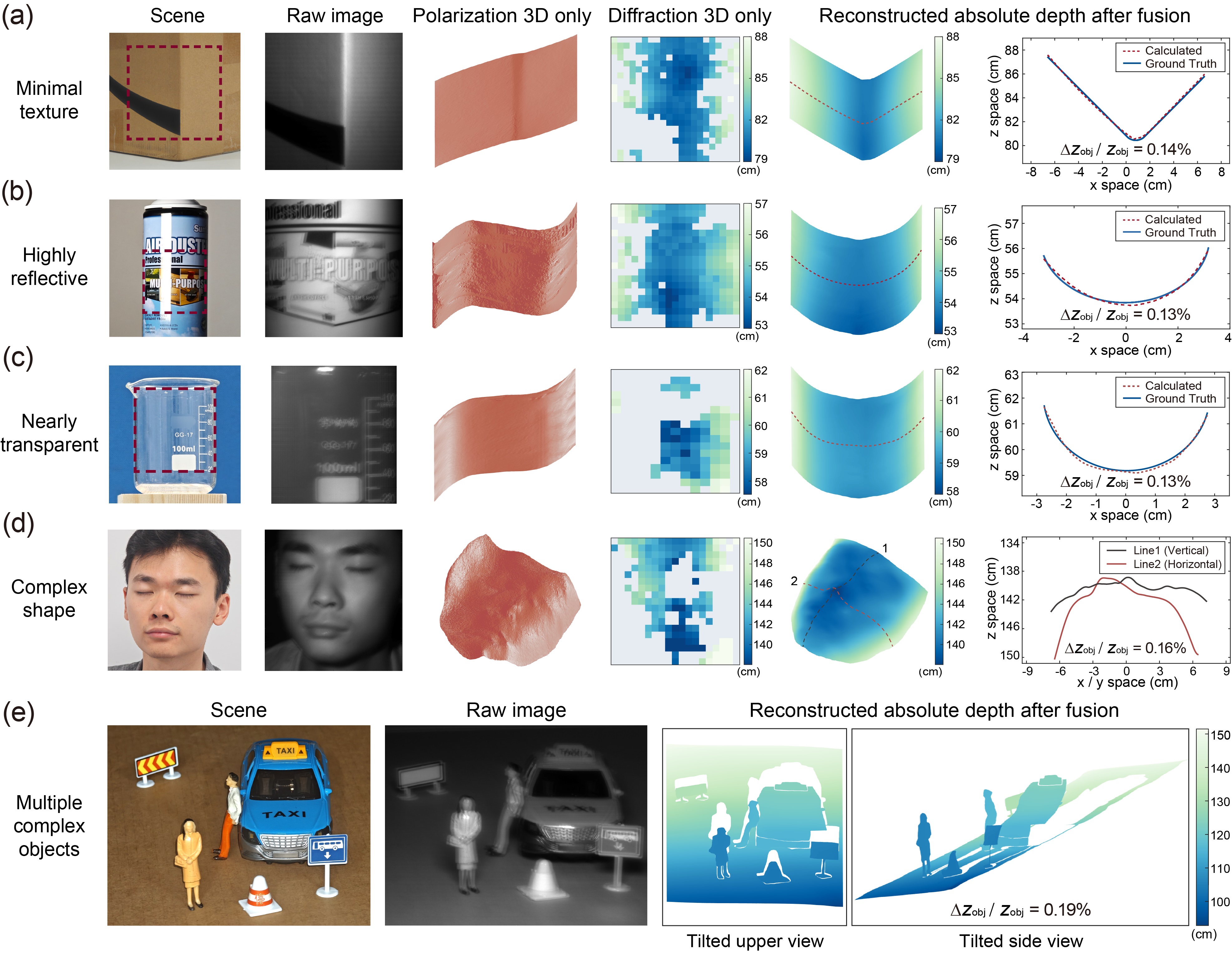针对以上难题,mk手机注册精密仪器系杨原牧副教授课题组提出了一种新型拓展单目三维(Extended Monocular 3D,EM3D)成像框架,该框架使用配备易于量产的折衍混合透镜及商用分焦面偏振CMOS的紧凑单目相机,可以快照式地同时获取衍射和偏振两种深度线索,结合多阶段融合两种深度线索的计算成像算法,实验实现了对传统挑战性场景(包括弱纹理、高复杂度、高反射或近乎透明的场景)的百万像素级精确三维点云快照式采集,且无需先验数据。此外,通过深度与偏振信息的结合可以通过材料属性实现进一步的物体辨识,这可能进一步扩展机器视觉在目标识别、活体检测等应用中的能力。