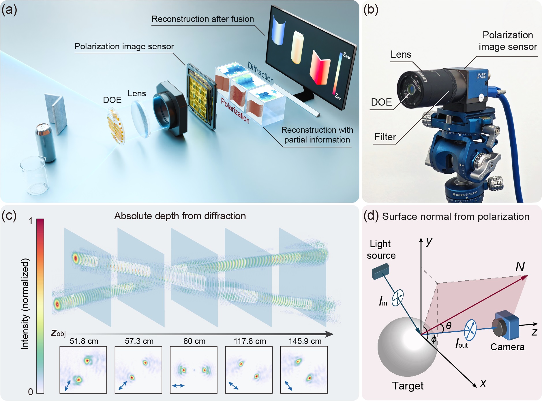 北京时间6月13日,相关研究成果以“基于衍射与偏振深度线索融合的拓展场景单目三维成像”(Extended monocular 3D imaging via the fusion of diffraction- and polarization-based depth cues)为题,发表于《光学》(Optica)。