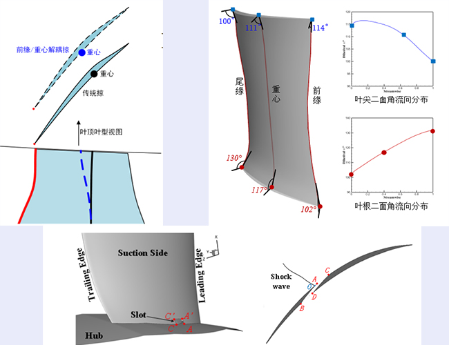 (a)前缘/重心解耦掠叶片技术(b)端区二面角控制技术(c)激波/交汇附面层诱导分离自适应射流控制技术