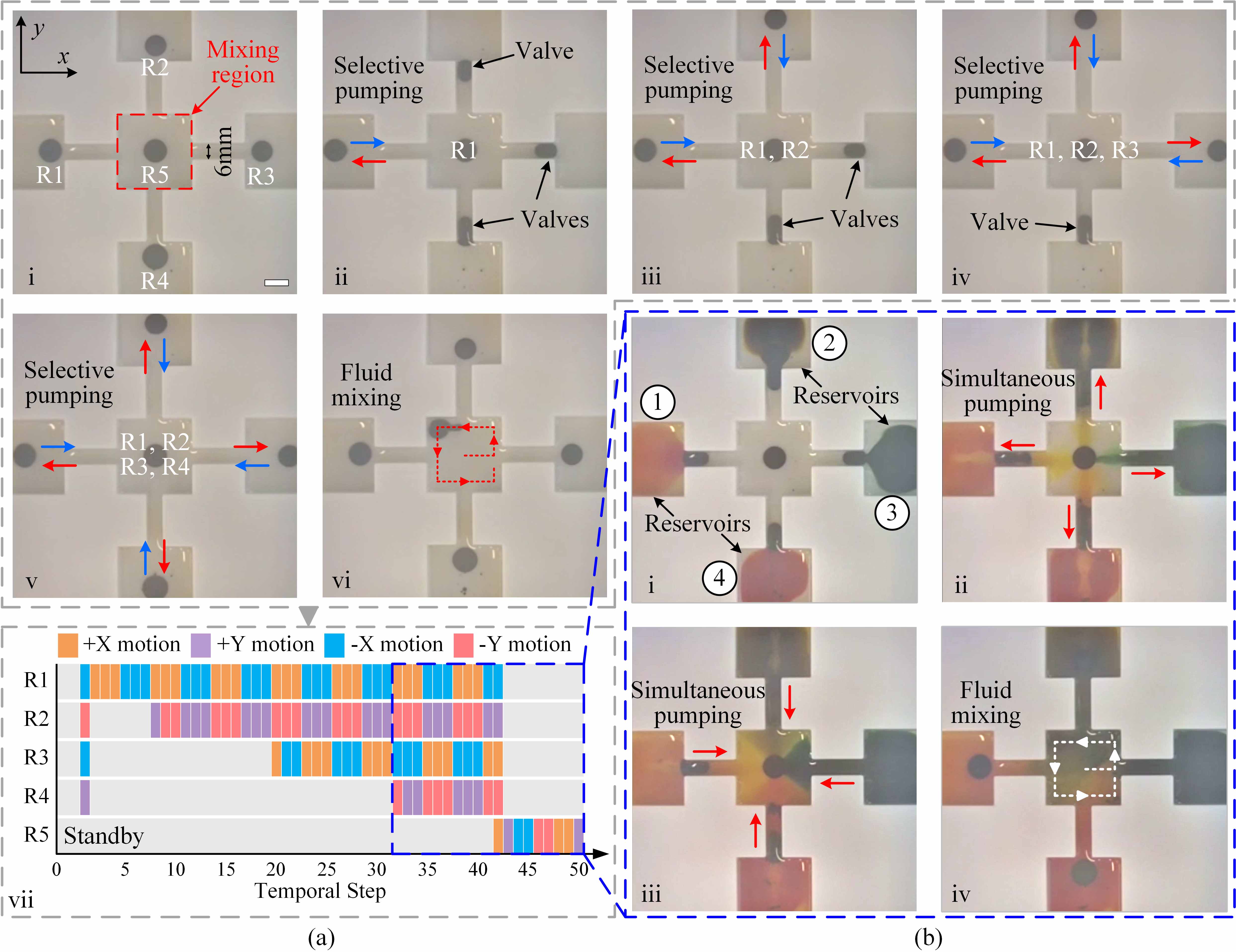 最后,团队展示了液滴机器人在复杂任务场景下的高效协同能力,包括自主排序、图案重构、数字显示、摩斯编码和流体混合等功能。在排序任务中,结合“归并排序”算法与磁阵列系统,实现多个液滴在有限步数内完成体积升序排列,整体效率较单个机器人操作提升三倍以上。在图案重构方面,系统可以动态调整液滴阵列,快速切换不同字母或摩斯码图案,完成信息的可视化编码。在流体混合实验中,多个液滴机器人分别从不同通道泵入染料,并在混合区完成主动搅拌,展现出该平台在数字微流控、反应调控与材料合成等领域的应用前景。