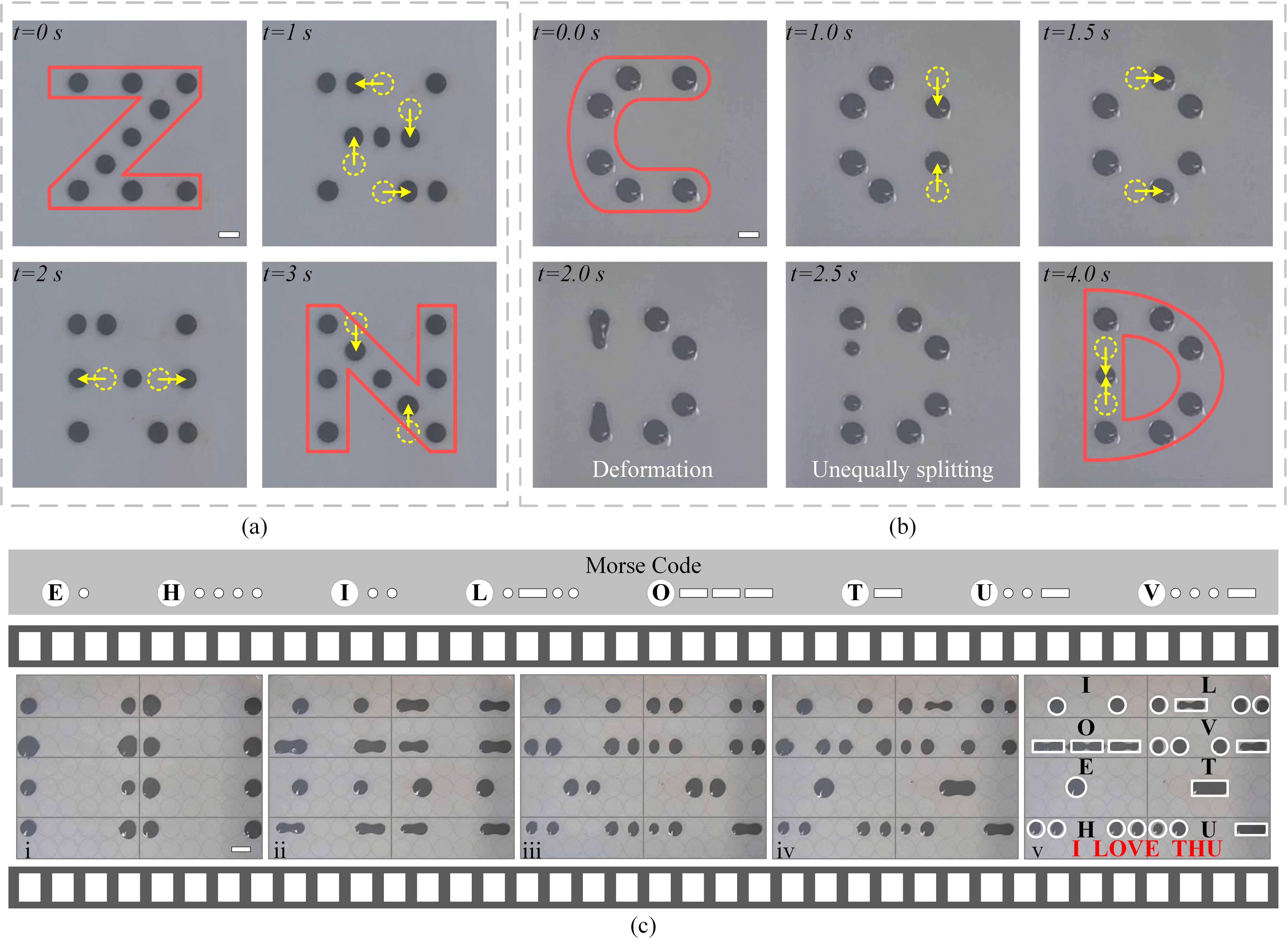近期,mk手机注册深圳国际研究生院副教授曲钧天团队围绕磁流体液滴机器人在大规模、独立与可编程操控方面的关键技术难题,成功开发出一套基于电磁线圈阵列的可编程操控平台。通过灵活部署液滴机器人,该平台在数字图案显示、信息编码及流体操作等领域展现出广泛的应用潜力。