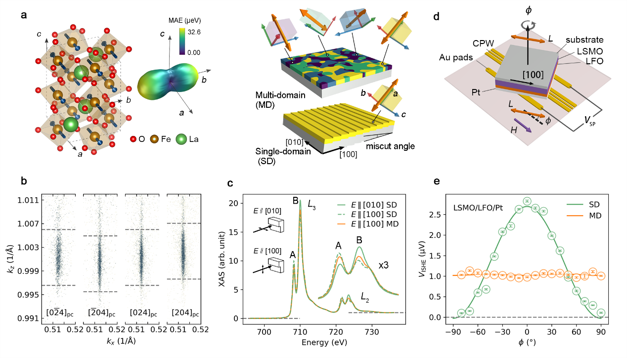 研究团队基于具有强自旋-晶格耦合的反铁磁氧化物铁酸镧(LaFeO₃),通过精确调控晶体对称性和衬底应变,成功获得了具有单结构畴和反铁磁畴的铁酸镧薄膜,实现了稳定、方向唯一的奈尔矢量。该材料能够高效地传输自旋极化与奈尔矢量平行的磁振子流,并完全阻断自旋极化与奈尔矢量垂直的磁振子流,表现出大的磁振子传输“开-关”比(图2)。