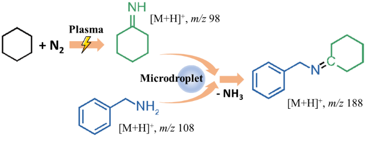 微液滴体系因其高比表面积、界面强电场和局部强酸性环境,近年来被证实可显著加速多种化学反应。本研究巧妙利用这一特性,在等离子体活化烷烃的基础上,进一步引入气态胺类化合物(如苄胺),使其与活化中间体共同被捕获至微滴表面,触发高效偶联反应。以环己烷与苄胺反应为例,在氮气氛围中,目标亚胺产物[C13H18N]⁺的生成效率显著提升,而在空气条件下则出现大量副产物(图2),凸显了气氛调控在反应选择性中的核心作用。