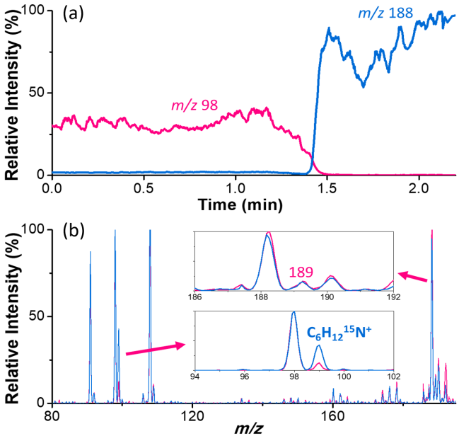 为深入揭示反应机理,研究团队使用离子阱质谱在线追踪了从烷烃活化到亚胺形成的全过程,并结合高分辨质谱和串级质谱对反应产物和中间体进行分析,以鉴定其化学组成及结构。图3所示趋势展示了苄胺加入时从活化产物到目标亚胺的转化,意味着烷烃放电活化生成的含氮活性物质是形成亚胺的关键中间体。更进一步,通过15N同位素标记实验,研究人员证实:反应中引入的氮气直接参与了C-N键的构建,检测到明显的[C6H1215N]+信号增强;而目标亚胺[C13H1815N]+未见显著增加(图3),排除了苄胺碎裂形成苄基正离子后与烷烃活化产物偶联的路径,这有力支持了“烷烃先被氮化,再与胺缩合”的反应机制。