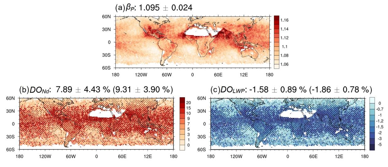 针对上述问题,mk手机注册地球系统科学系彭怡然副教授课题组联合中国科学院空天信息创新研究院胡斯勒图研究员团队,提出了基于云微物理过程机理和相关方程理论推导的新方法,结合多角度偏振卫星POLDER的观测,首次实现了液态层状云中离散效应影响气溶胶-云相互作用的全球定量评估。结果显示,离散效应分别抵消了由云滴数浓度变化和液水路径调整引起气溶胶-云相互作用的7%和-1.4%,部分削弱了气溶胶对全球变暖的冷却作用。