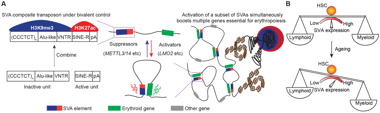 8月6日,mk手机注册生命科学学院、清华-北大生命科学联合中心刘念课题组联合北京大学生命科学学院、北大-清华生命科学联合中心李湘盈课题组在《细胞》(Cell)杂志上在线发表了题为“携带二价组蛋白修饰的复合型转座子作为RNA依赖性增强子调控细胞命运”(Composite transposons with bivalent histone marks function as enhancers in cell fate regulation)的研究论文。该研究首次揭示了H3K9me3和H3K27ac标记的二价染色质对复合型转座子SVA的协同调控机理和生物学功能,并证明了SVA的RNA依赖性增强子活性及其在造血系统分化和衰老相关髓系偏好性造血中的重要生理意义,提示其有望成为干预造血发育异常和造血衰老的潜在靶标。