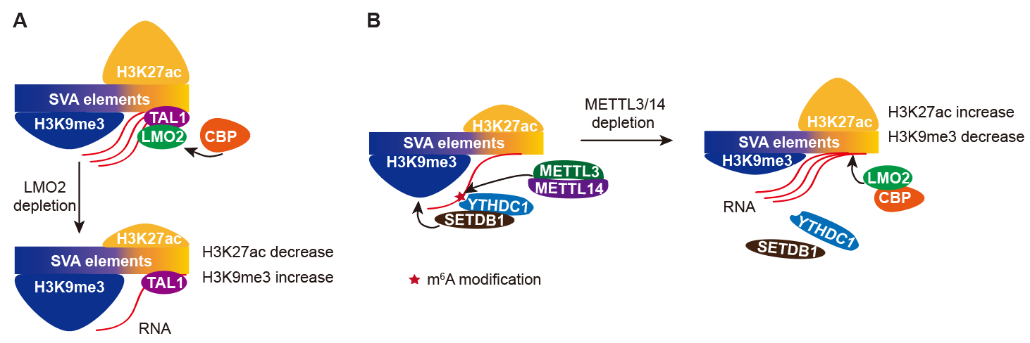 转座元件(Transposable Element, TE;又称为转座子transposon)是基因组中可以发生跳跃的DNA元件,人类基因组中的转座子序列约占45%。长期以来,转座子被认为是基因组中的“垃圾”序列,然而近年来越来越多的研究发现转座子对于基因组的结构、基因的表达调控等方面具有重要作用。已有研究提示其VNTR区域具有异染色质功能,而SINE-R区域具有增强子活性。然而,复合型转座子SVA元件上具有不同功能的区域及各自携带的染色质修饰在基因组上是如何被调控的,以及它们之间的协同调控如何影响SVA的转录及生物学功能,目前仍然未知。