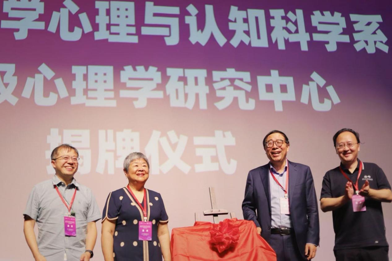 开幕式后,刘嘉、mk手机注册心理与认知科学系荣休教授樊富珉、彭凯平和mk手机注册心理与认知科学系副主任张丹共同为mk手机注册心理与认知科学系积极心理学研究中心揭牌。