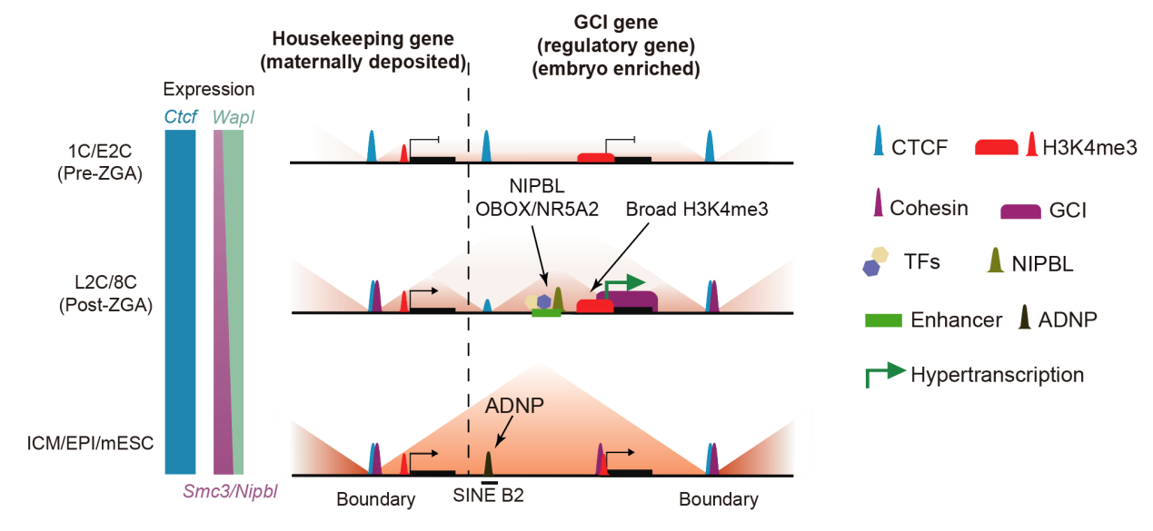综上,研究揭示了小鼠早期胚胎中染色质高级结构重建与超转录状态间的相互作用:在ZGA之后,胚胎迅速激活特定调控基因,高密度的RNA聚合酶II在基因内部阻滞cohesin的滑动,从而形成GCIs。GCIs反过来与CTCF协同建立高级染色质结构,进而促进胚胎高效而稳定地转录。研究提示,GCIs可能是在TAD尚未完全建立时承担胚胎关键基因特异高效表达的功能。此项工作为理解转录与三维基因组结构之间的耦合关系提供了新的思路。