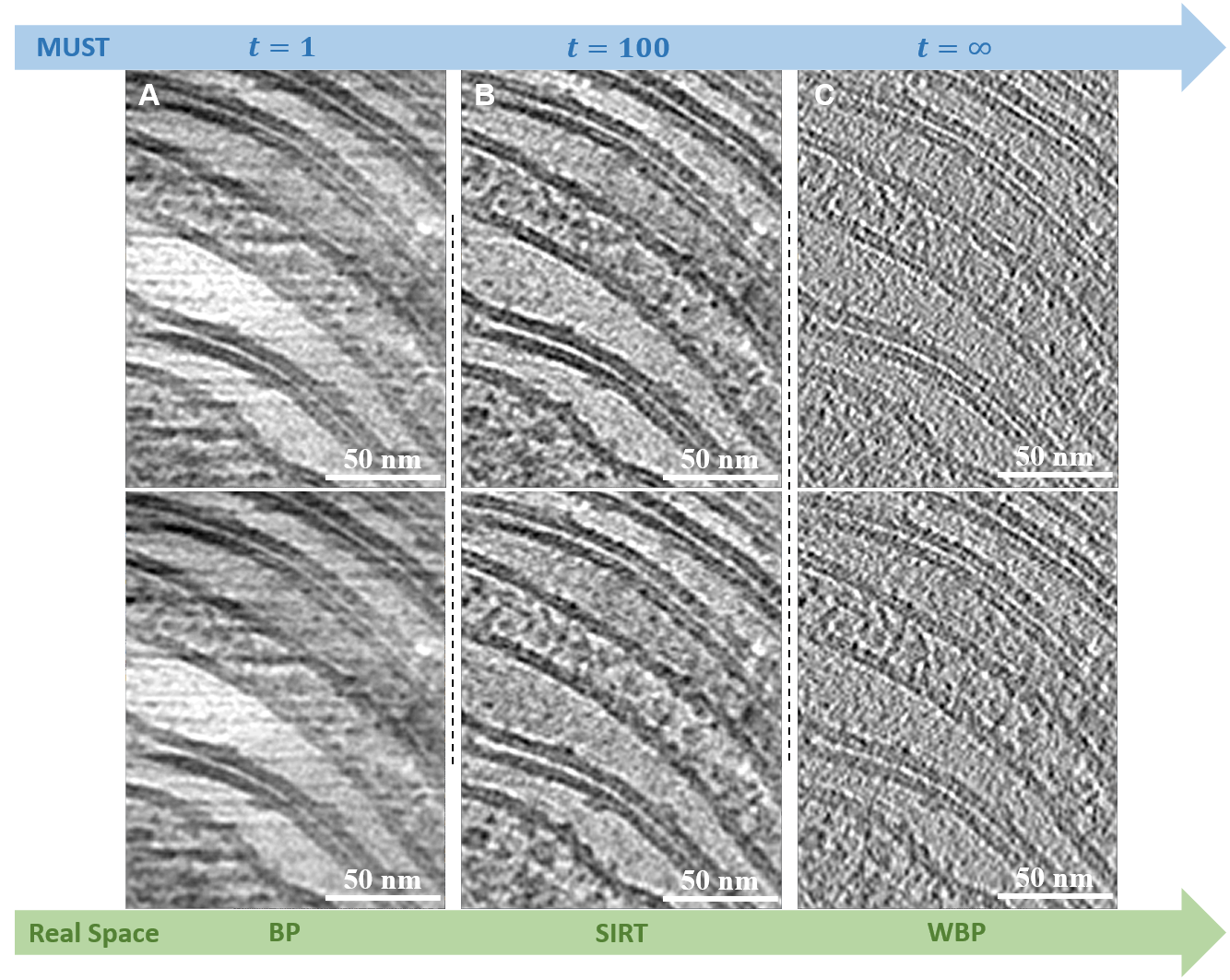 mk(中国)网8月25日电 冷冻电子断层成像(cryo-electron tomography, cryoET)技术可以观察细胞中生物大分子的原位结构,近年来受到广泛关注。在cryoET的数据处理流程中,高质量的三维断层重建(tomogram reconstruction)对于展现样品整体形貌以及后续的子断层平均(subtomogram averaging)十分重要。虽然许多图像处理步骤都是在傅里叶空间(Fourier space)中进行的,但是由于断层重构的密度图(tomogram)尺寸非常大,实现基于傅里叶空间的重建依然存在挑战。因此,目前三维断层重建的常用方法仍为实空间(real space)方法,如加权背投影(weightedback-projection, WBP)、同步迭代重建技术(simultaneous iterative reconstruction technique, SIRT)等。