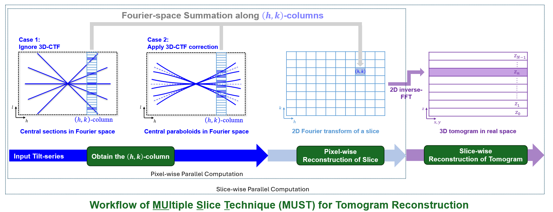 近日,mk手机注册生命学院李雪明副教授课题组和电子系沈渊教授课题组联合在《超显微镜》(Ultramicroscopy)在线发表题为“基于傅里叶空间的冷冻电子断层成像多层重建方法”(Fourier-based multiple-slice reconstruction in cryo-electron tomography)的研究论文。论文报道了一种基于傅里叶空间的冷冻电子断层成像三维断层重建方法MUST(MUltiple Slice Technique,图1)。该方法将三维重构密度图看作是由一系列平行平面层(parallel slice,PS)组成的,通过逐层独立计算的方法来合成最后的三维图像。而对于一个平行平面层的计算是通过在傅里叶空间按像素列投影计算得到的。由于像素列的计算是互相独立的,可以实现像素级的并行计算。由此形成实空间平面级并行与傅里叶空间像素级并行的两级并行架构,可大幅提升重建效率。通过对傅里叶空间中频点的相应加权操作,MUST可以获得与基于实空间的WBP和SIRT方法衬度相似的重构结果(图2)。研究团队同时发现,在考虑样品离焦量梯度(defocus gradient)的三维衬度传递函数校正(three-dimensional contrast transfer functioncorrection,3D-CTF correction)中,傅里叶空间中的平面状的中心截面会劈裂为一对中心共轭抛物面(pairs of conjugate central paraboloids, PCCP)。