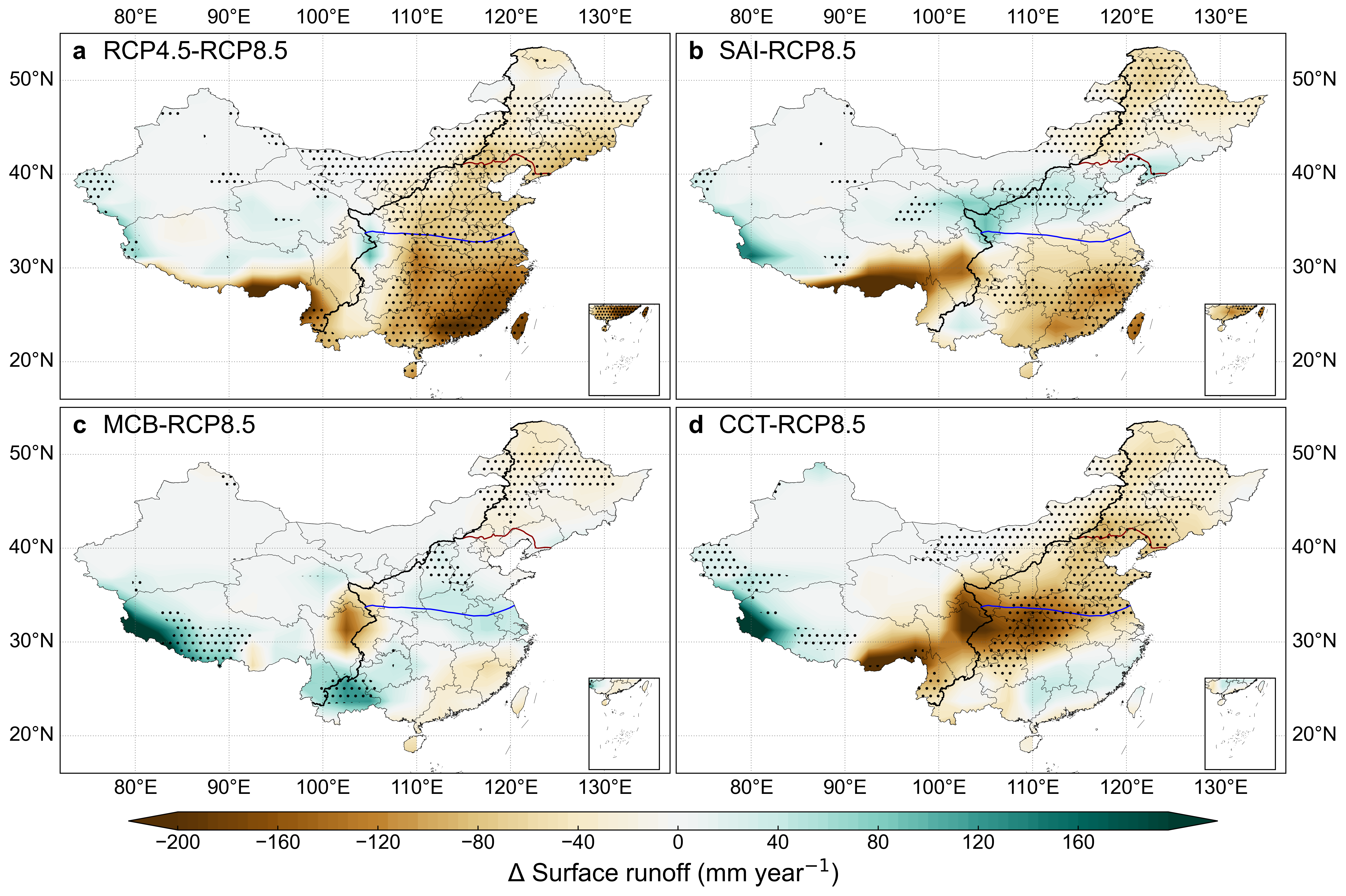 图1.与RCP8.5情景相比减排路径与气候干预下中国年均地表径流量预估变化