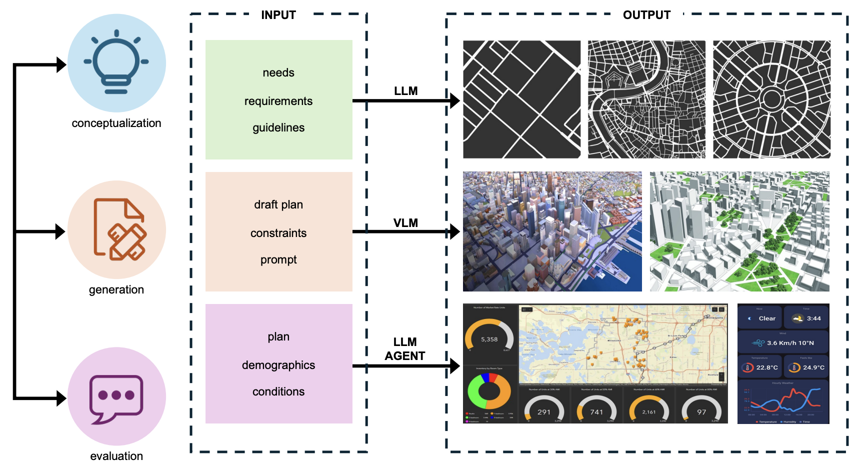 针对传统方法的不足,研究团队创新性地提出了一个包含概念设计(Conceptualization)、方案生成(Generation)和效果评估(Evaluation)三个核心阶段的闭环框架。该框架由大语言模型、视觉大模型(VLM)和大模型智能体(LLM Agent)协同驱动,为人类规划师提供全流程的智能辅助。