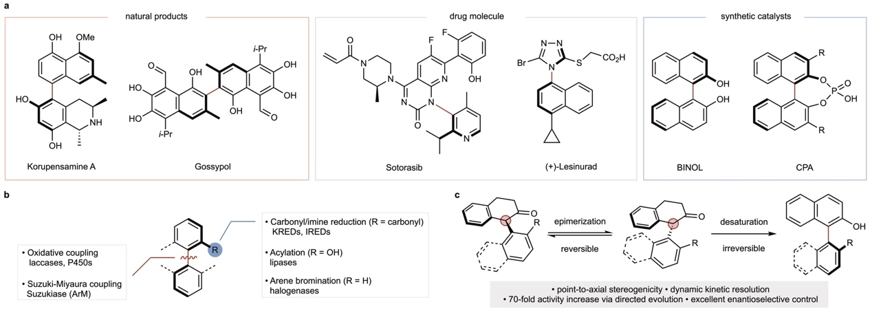 mk(中国)网9月11日电 轴手性(Atropisomerism)是一类因单键旋转受限而形成的稳定立体异构体,其构型稳定性主要取决于旋转势垒及空间位阻效应。这类化合物广泛存在于天然产物、药物分子以及手性配体和有机小分子催化剂中。如何高效且选择性地构建轴手性化合物,一直是合成化学和生物催化领域的研究热点。