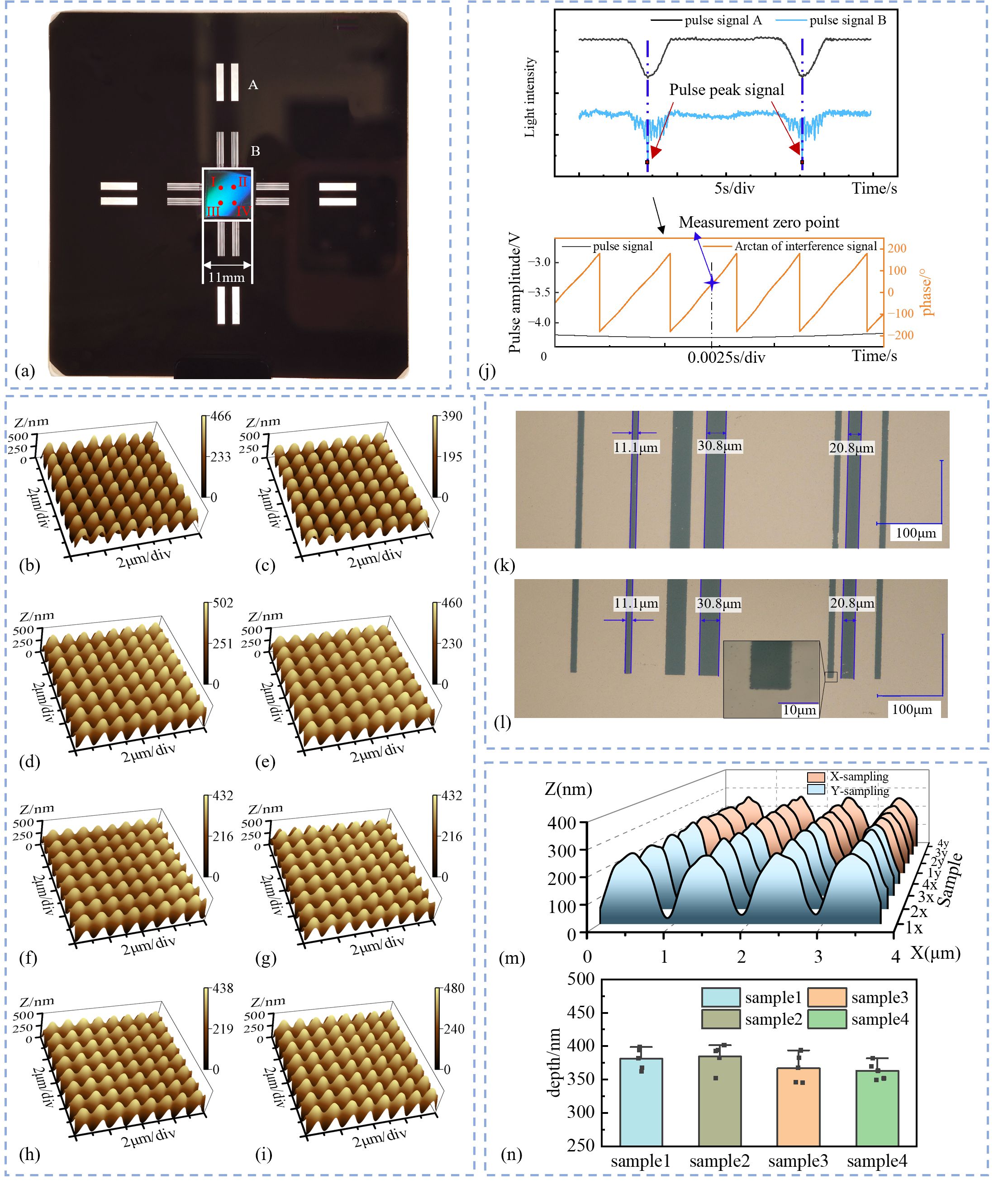 研究团队对加工样品进行了系统的表征与测试。在实验样品中,纳米级线宽的周期性结构具有长达11mm的连续区域。通过对多个区域进行原子力显微镜(AFM)测量,结果显示微结构尺寸高度一致,充分验证了干涉光刻在大尺寸范围内实现高一致性微纳结构制备方面的显著优势。将该样品集成于干涉测量系统后,实验实现了在3000μm范围内优于1nm的位移分辨率与±0.4 nm的测量重复性,同时具备绝对定位能力,展现出优异的测量性能。