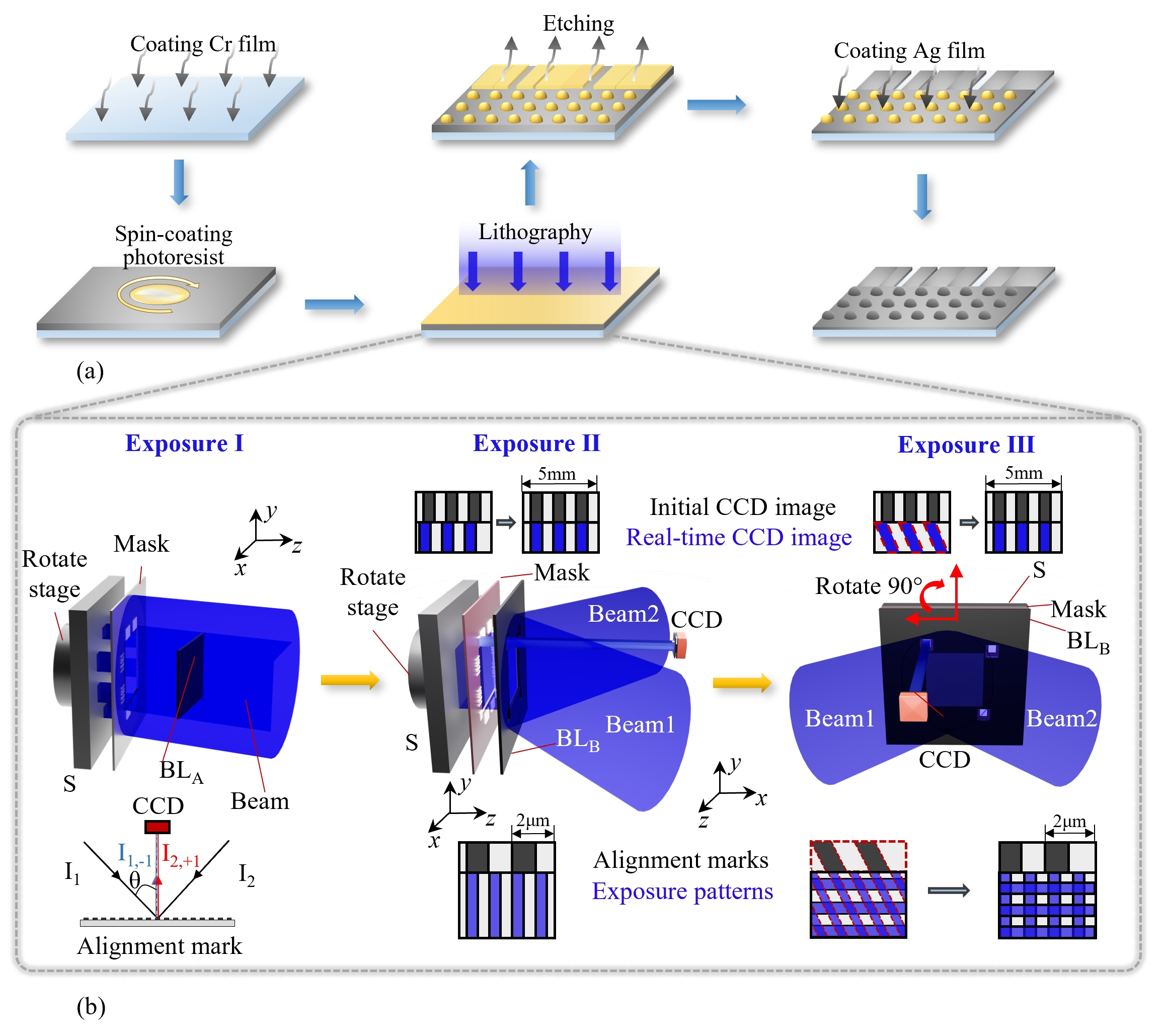 研究团队构建了可多自由度调节的干涉曝光系统,集成了双光束干涉曝光及高精度条纹锁定系统,通过动态的相位锁定,实现区域内的高一致性图案加工。为确保跨尺度结构加工过程中不同图案区域的方向一致性,研究团队设计了具备对准标记的掩模版,对准标记在干涉光路中产生衍射参考条纹,通过相机记录,并依据参考条纹的状态判断曝光干涉条纹的方向,通过光路中的高精度调节系统对曝光干涉场的状态进行反馈控制。此外,研究还设计了差异化区域加工策略,通过选择性沉积与刻蚀工艺,分别实现反射型周期结构与透射型非周期结构的功能分区,为构建复杂多功能光学编码器件提供了工艺基础。