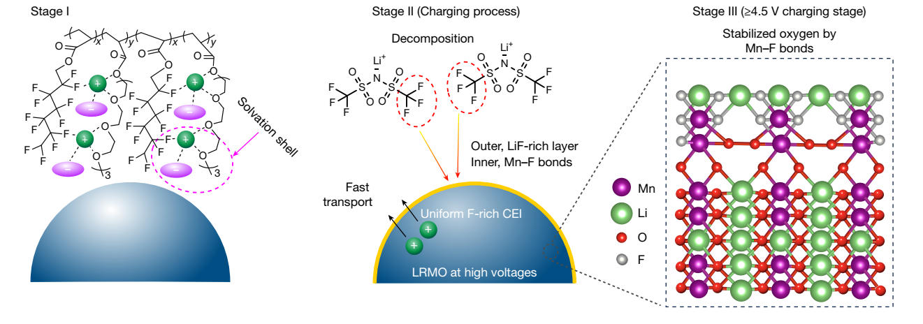 近期,mk手机注册化工系张强教授团队提出“富阴离子溶剂化结构”设计新策略,成功开发出一种新型含氟聚醚电解质。该电解质通过热引发原位聚合技术,有效增强了固态界面的物理接触与离子传导能力。研究团队在聚醚电解质中引入强吸电子含氟基团,显著提升了其耐高压性能,使其可匹配4.7V高电压富锂锰基正极,实现了单一电解质对高电压正极与金属锂负极的同步兼容。基于锂键化学原理,团队构建了独特的“–F∙∙∙Li⁺∙∙∙O–”配位结构,诱导形成具有高离子电导率的富阴离子溶剂化结构,进而在电极表面衍生出富含氟化物的稳定界面层,显著提升了界面稳定性。