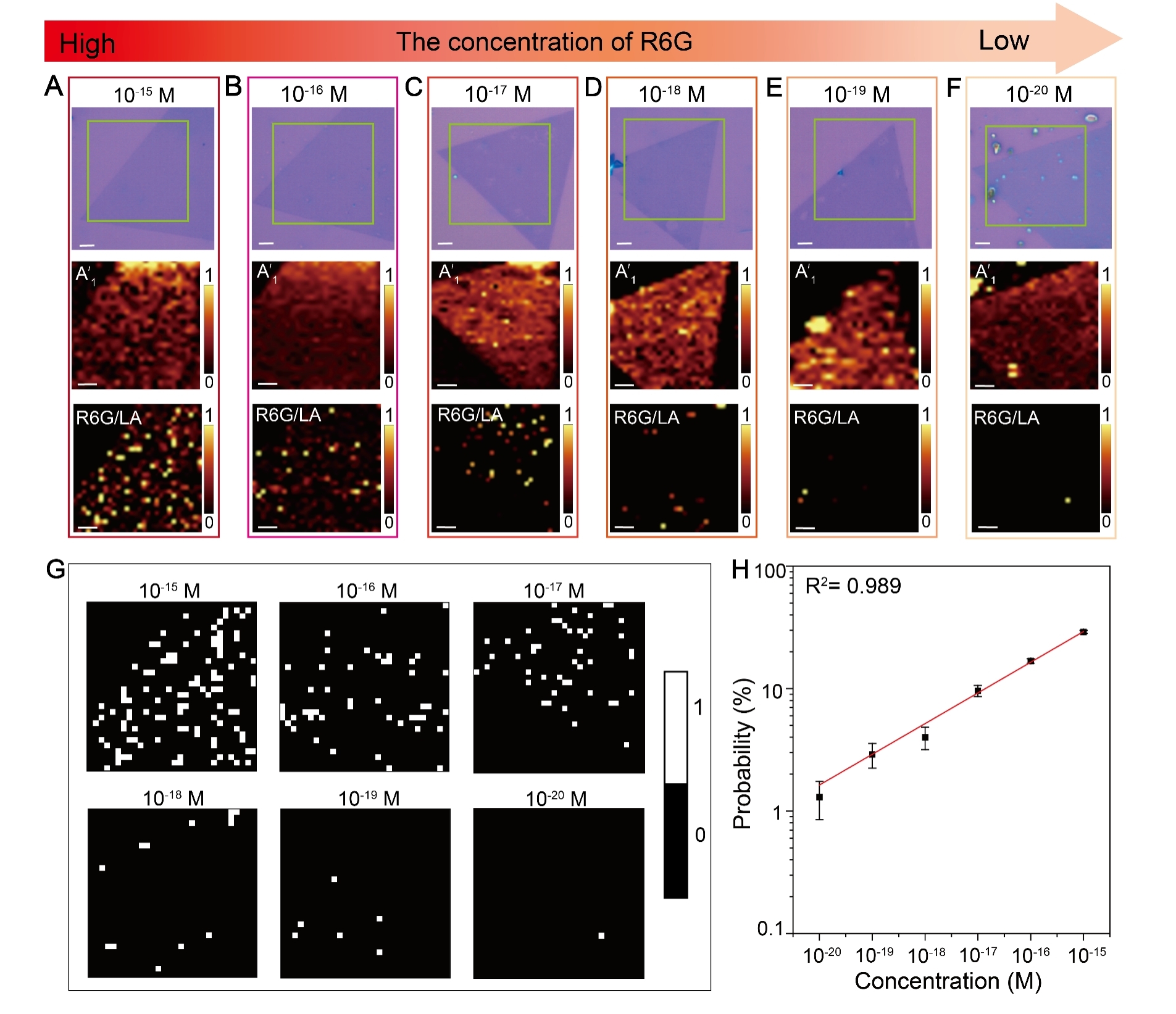 图2.蓝移WS2上低浓度R6G的SERS成像及定量分析