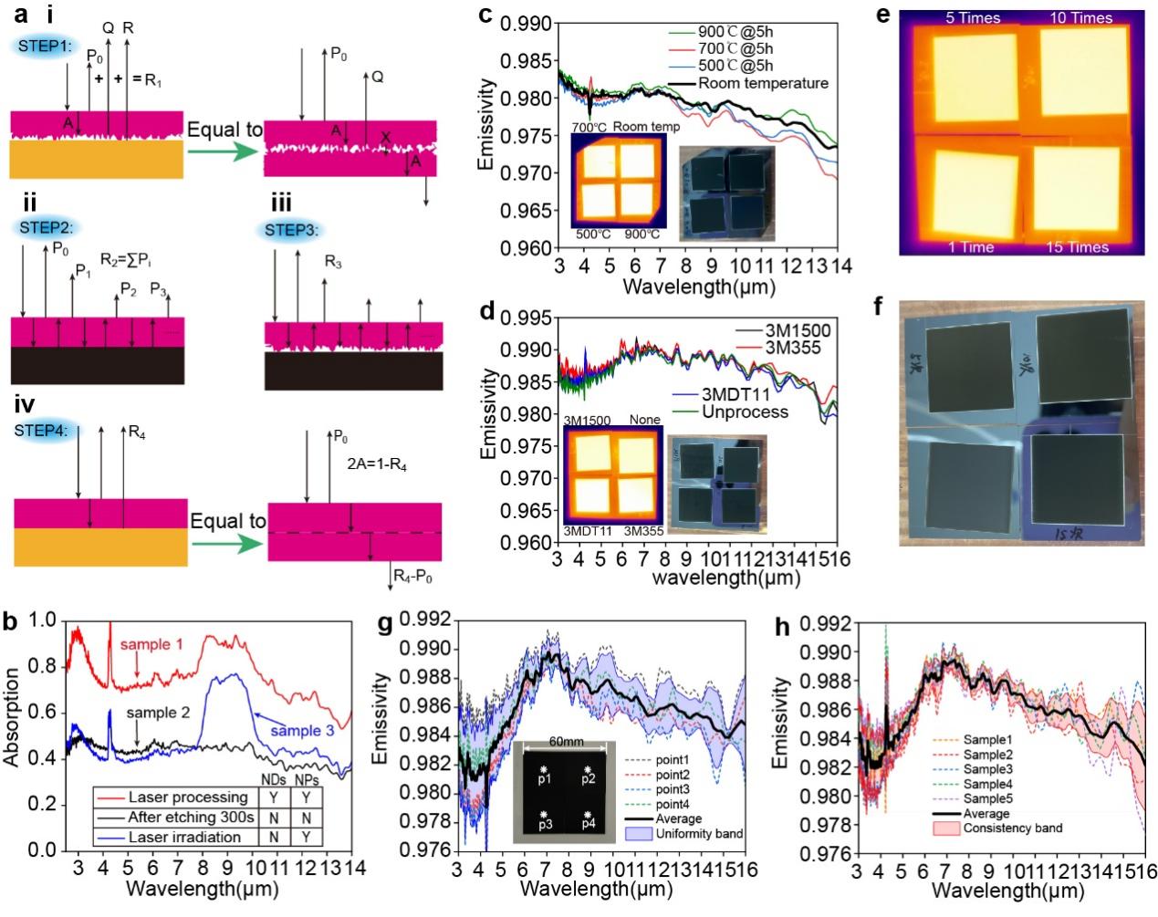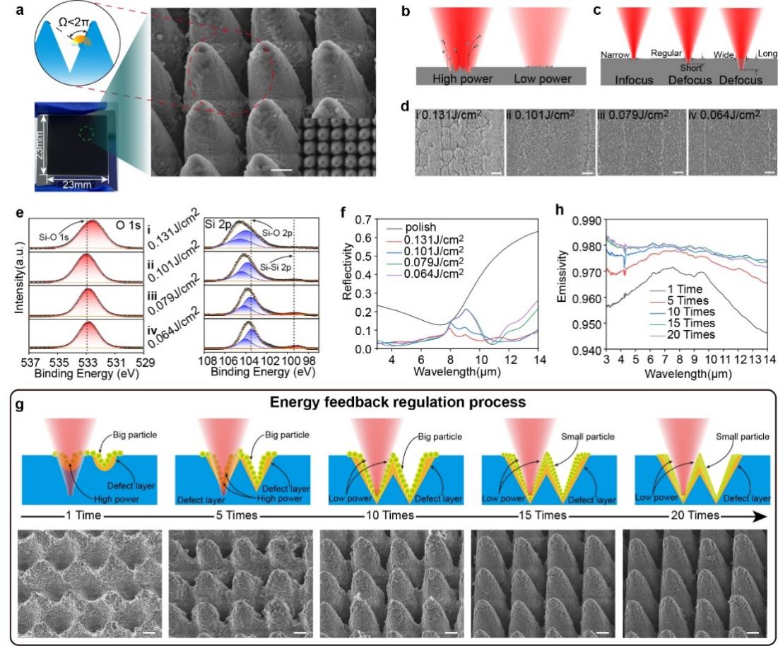 研究成果以“超快激光诱导表面分层结构及纳米缺陷工程的超宽带平面黑体”(Ultra-broadband Plane Blackbody by Ultrafast Laser Induced Surface Hierarchical Structuring and Nanodefect Engineering)为题,于9月20日在线发表于《先进材料》(Advanced Materials)。