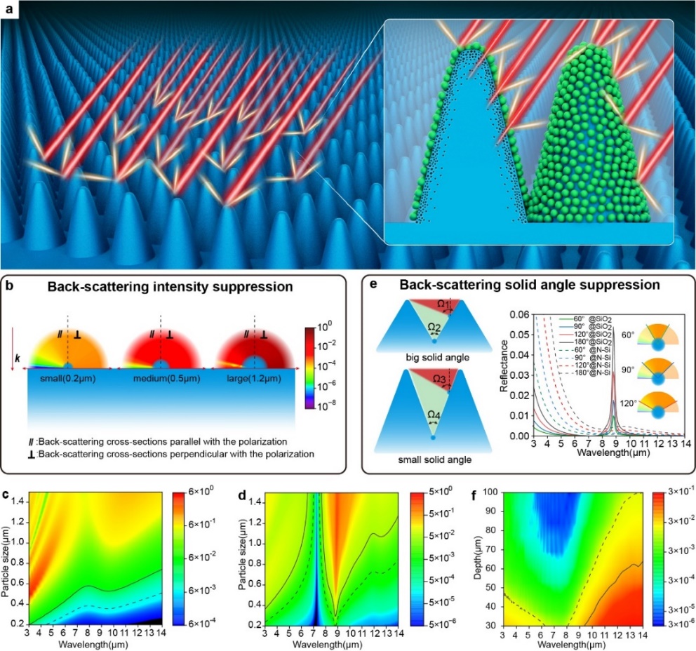 孙洪波、白本锋教授团队在对半导体表面的散射和吸收机制深入研究基础上,提出一种基于超快激光的一步工艺方法,该方法利用飞秒激光与半导体材料相互作用过程中的能量负反馈调节机理和热缺陷激发机制,能够在激光束的扫描中同时实现材料表面锥形阵列跨尺度周期结构的制备和对材料的深能级调控,从而在不引入任何其他材料或涂层的条件下,使半导体材料表面成为超宽带、超高发射率的黑体,解决了传统面源黑体涂层变性、脱落污染、均匀性和稳定性差、寿命短等难题,为制备大面积、低成本、高可靠性、高性能的新型面源黑体提供了解决方案。