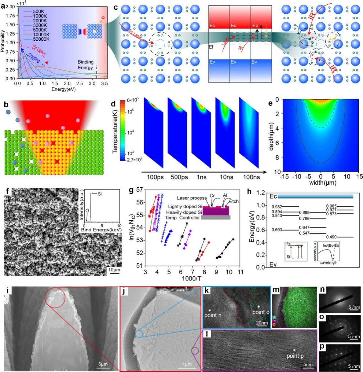 对于进入材料内部的光,强化吸收是关键。团队发现了当飞秒激光作用到材料表面后,剧烈的升温和降温会使晶格原子逸出形成高密度缺陷,进而在材料表面引入深能级,这些单一能级上的电子跃迁到导带,实现超宽带的光吸收增强。