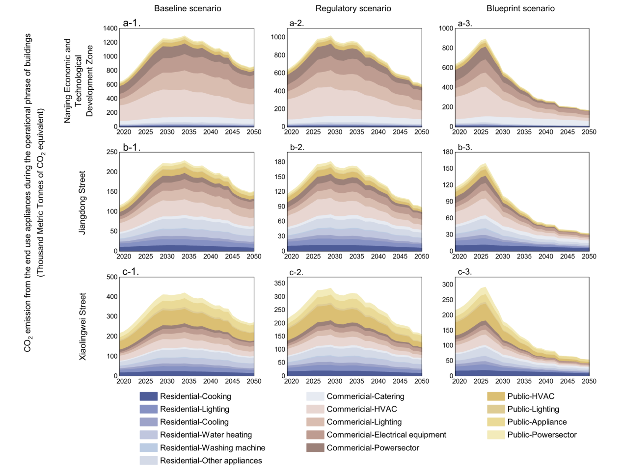 针对上述问题,mk手机注册地学系关大博教授团队开发了CEADs-Building模型,融合了建筑类型、功能与几何形态等多维属性,并耦合了电厂设施级别的能源供应数据,实现了对建筑运行阶段直接(范围一)和间接(范围二)碳排放的精准核算。研究进一步提出了涵盖需求侧与供给侧的多项减排技术,并通过基准、调控和蓝图三种情景,系统分析了南京市的建筑脱碳路径。