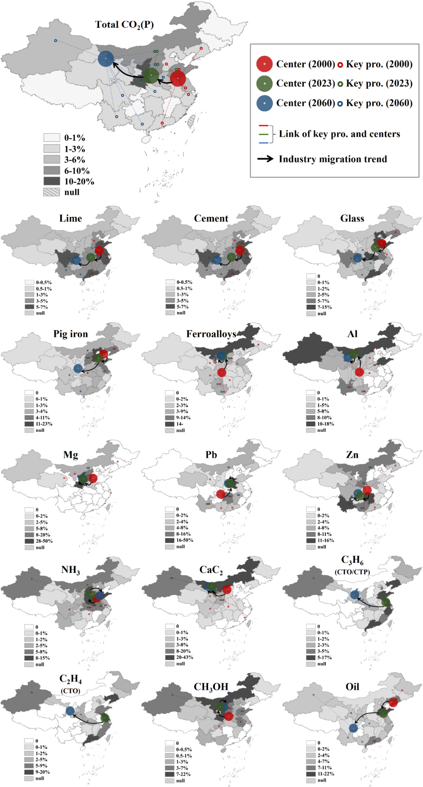 基于所构建的数据库,研究团队进一步揭示了中国过程碳排放及关联行业的地域迁移规律。研究结果表明,中国过程碳排放重心总体呈现向西迁移的趋势。对于关联行业,资源密集型产业重心向中西部省份迁移,技术密集型与市场驱动型产业重心向东部沿海省份迁移。