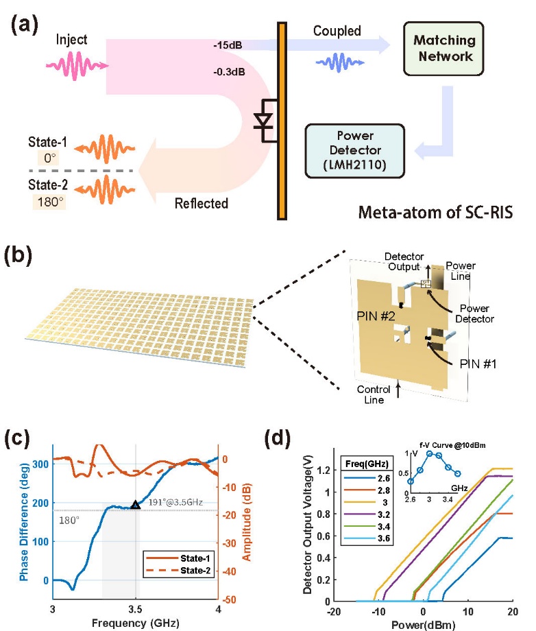 针对上述RIS控制难题,mk手机注册电子工程系戴凌龙团队与东南大学信息科学与工程学院崔铁军团队借鉴了光学中的全息成像原理,提出了一种自控制RIS方案(self-controlled RIS, SC-RIS)。如图2所示,通过在RIS单元中额外集成的低成本微波功率计,SC-RIS可以检测基站与用户信号在RIS处发生电磁干涉所形成的全息图,RIS利用此全息图就可以自主反推出用户的角度信息进行波束赋形,从而实现了不依赖于基站控制的RIS独立自主控制。图3展示了自控制RIS单元的硬件实现及电磁特性。