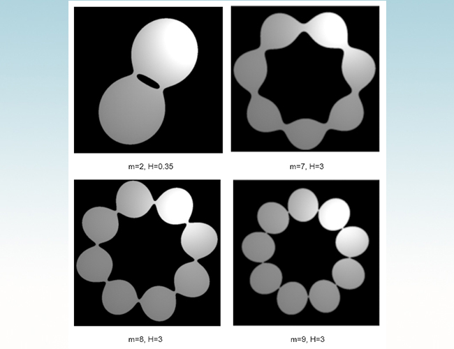 对于给定的H (H≠0, H2≠1/3),得到平均曲率为H的新曲面可能不只一个,H越大,新曲面的个数越多。例如,当H=0.35时,只有1个新的CMC 环面,对应m=2;当H=3时,得到共有3 个不同的CMC 环面,对应的m 依次为7,8,9。