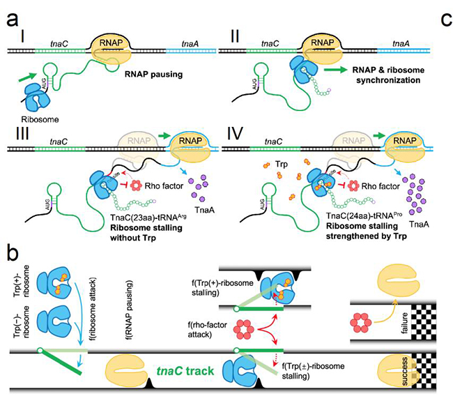 在此基础上,为了回答FACS-seq分析是否完整捕获了全部重要的响应中间状态,以及这些动力学中间态如何相互协调影响tnaC响应性能这一基本科学问题,论文以新发现的tnaC响应过程关键节点为基础,建立了描述其协调RNA聚合酶、核糖体和Rho转录终止因子三种大分子机器动力学行为的随机过程模型,该模型能够准确预测不同突变体的响应性能,对于tnaC基础响应和诱导相应之间的平衡关系给出了定量的机制性理解。最后该模型为改造tnaC传感器的性能指标提供了指导方案,据此获得了检测范围有明显扩展的tnaC传感器突变体。
