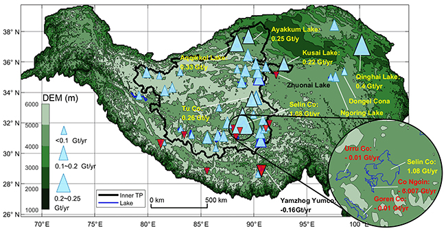 青藏高原湖泊水量变化空间分布图