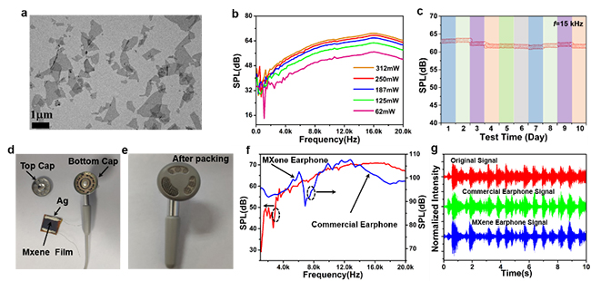MXene的表征及器件的声学测试图: a) Ti3C2纳米片的SEM图;b) AAO衬底上声谱输出图;c)稳定性测试图;d-e) 封装后的MXene耳机照片;f-g) 商用耳机与MXene耳机的声谱响应和音频信号图