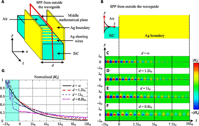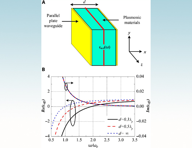 图1. 等离子体材料内电磁波传播损耗降低方法:(A)波导加载结构,(B)损耗调控机理