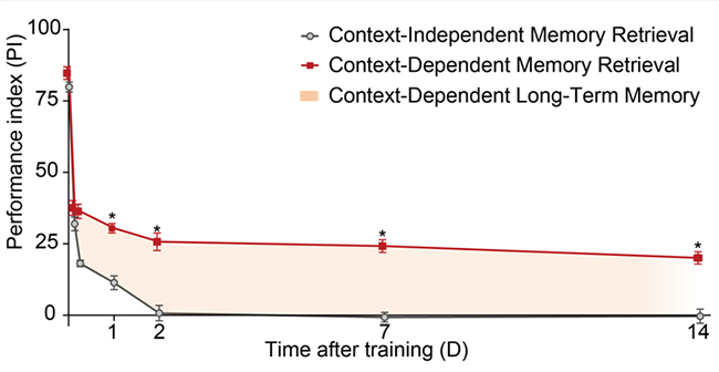 在整个学习记忆研究领域的一个常识是长时程记忆的形成需要一个维持数小时的、需要新蛋白质合成的记忆固化过程。在果蝇嗅觉惩罚性记忆中,长时程记忆的形成更是需要重复十次、每次的时间间隔在15分钟的学习过程。这种训练下形成的长时程记忆需要数小时的时间来进行固化,维持7天以上。而简单的一次训练则只能形成相对不稳定的记忆,并在24小时之内几乎完全被遗忘掉。今日钟毅课题组发表的论文则发现了一种长期维持的情境依赖记忆(cLTM, context-dependent long-term memory)。研究人员发现,在果蝇中简单地一次训练就能够马上形成这种记忆,不需要固化过程却能够维持超过14天而不衰减。