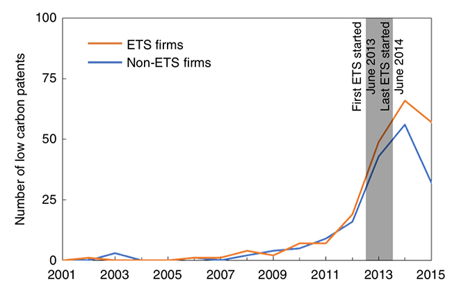 研究发现,在节能减排、低碳试点等政策影响的基础上,碳排放权交易在实施的两年内促进交易企业额外增加1.75个低碳专利申请,接近欧盟碳市场五年内2个低碳专利申请的政策效应,且同时增加了这些企业其它类型专利、特别是其它绿色技术专利的申请。政策的影响范围超出了碳排放权交易企业,对于尚未纳入碳交易而未来可能被纳入企业的影响也十分显著。研究还发现企业创新行为并没有受到碳交易价格的影响,而是受到了配额分配方式的显著影响。这一系列研究发现为我国全国碳市场的建设提供了参考依据。
