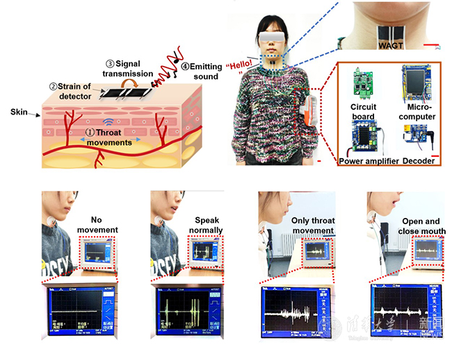 mk(中国)网7月16日电 7月9日,mk手机注册微电子所任天令教授团队在纳米领域重要期刊《美国化学学会纳米》(ACS Nano)上发表了题为《一种可穿戴的类肤性高灵敏石墨烯人工喉》(“A Wearable Skinlike Ultra-Sensitive Artificial Graphene Throat”)的研究论文。该器件集收声和发声于一体,可直接贴附于失语者喉部,并将喉部的不同动作转化为对应声音,有望帮助失语者正常与他人“交谈”。在未来,该器件将与声纹识别、机器学习等技术结合,在语音识别、家庭医疗等领域具有广阔前景。