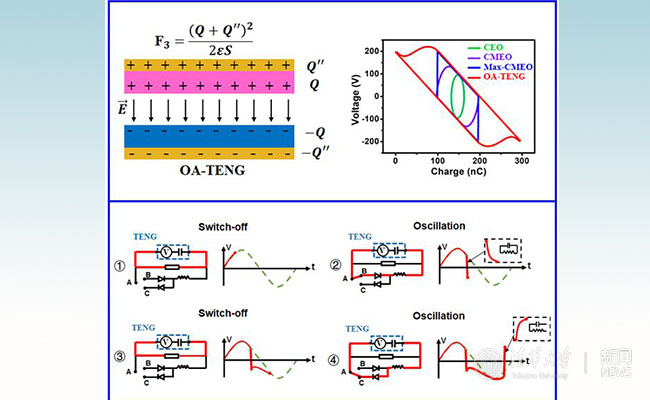 2015年,研究人员类比于热力学中的卡诺循环,提出了摩擦纳米发电机的理论单周期输出极限及其实现方式(Cycles for Maximum Energy Output, CMEO)。此次,微纳电子系王晓红教授课题组与美国佐治亚理工学院王中林教授课题组合作,提出了一种新型电荷分布方式以及外部电路实现方法,通过理论和仿真验证了其对于原CMEO极限的突破,并通过实验进行了验证。研究者指出,此种电源管理方法不仅在任意负载下都能突破原有输出极限,且尤为适用于小型电子设备的低输入阻抗情形。