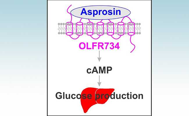 在该项研究中,研究人员通过GPCR siRNA文库筛选发现嗅觉受体OR4M1的敲低抑制了糖异生基因表达,Olfr734(人源OR4M1的同源基因)敲除小鼠表现出糖异生能力下降以及胰岛素敏感性增强。通过用纯化的OLFR734在FBS(牛血清)中分离签订了其配体可能是Asprosin。该研究进一步通过体外结合试验证明了Asprosin是OLFR734的配体(Kd约等于18nM)。同时他们通过小鼠水平的生理实验发现Asprosin通过OLFR734激活了下游cAMP-PKA通路,促进糖异生基因G6pc和Pck1的表达,进而升高血糖。给小鼠注射Asprosin抗体后能够阻断Asprosin/OLFR734对糖异生的促进作用,因而干扰Asprosin和OLFR734的相互作用或许可以作为糖尿病治疗的一个靶点。
