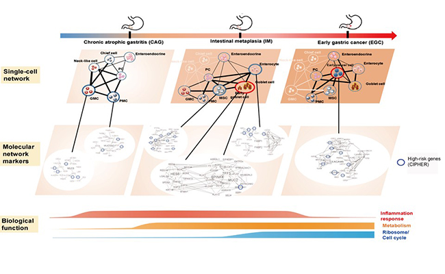 同时,一些代表性细胞类型也呈现出个性特征,如胃腺底细胞在胃炎向胃癌转化的过程中会获得细胞干性,提示其可能是介导胃炎癌转化的重要细胞类型。有趣的是,从单细胞网络中新发现的一些分子特征,被课题组前期自主研制的、基于关系推断的致病基因算法CIPHER成功预测,表明人工智能和生物信息算法在解析机体复杂生物网络上具有很大潜力。