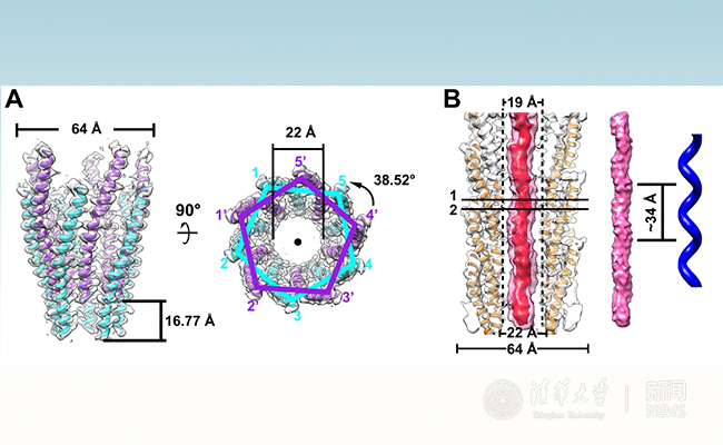 图注:A. 噬菌体IKe病毒衣壳结构图,位于同一高度的5个主要衣壳病毒蛋白p8构成病毒衣壳蛋白层。相邻衣壳蛋白层通过旋转为38.52o,高度为16.77 埃螺旋排列。B. 左侧为非对称重构解析得到的噬菌体IKe剖面图,其中病毒内部环状DNA以左手螺旋的方式存在。两个不同阈值下(17 σ和26 σ)的环状DNA电子密度分别用半透明粉色和不透明红色表示,病毒衣壳相关电子密度用透明白色表示,病毒主要衣壳蛋白p8结构用橙色表示。中间为重构得到的在电子密度阈值为17 σ下的环状DNA结构,其螺距约为34埃。右侧为根据螺距模拟得到的左手螺旋结构。